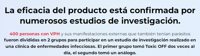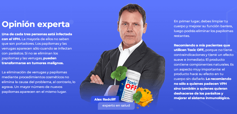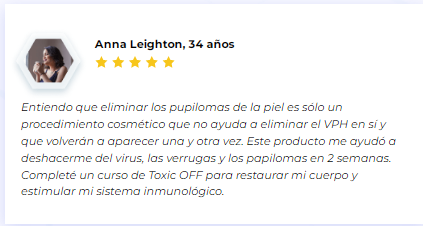 Entiendo que eliminar los papilomas de tu piel es tan solo un procedimiento estético que no ayuda a deshacerse del VPH en sí y que volverán a surgir una y otra vez. Este producto me ayudó a deshacerme del virus, las verrugas y los papilomas en 2 semanas. Completé un ciclo de tratamiento con Toxic OFF para recuperar mi cuerpo y mejorar mi sistema inmunitario.
