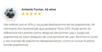 Me infecté por el VPH y no logré deshacerme de los papilomas. Mi hermana me recomendó probar Toxic OFF. Pude sentir la diferencia justo después del primer uso y luego los papilomas empezaron a desprenderse después de una semana de uso. Completé el ciclo de tratamiento y las marcas de los papilomas desaparecieron como si nunca los hubiera tenido.